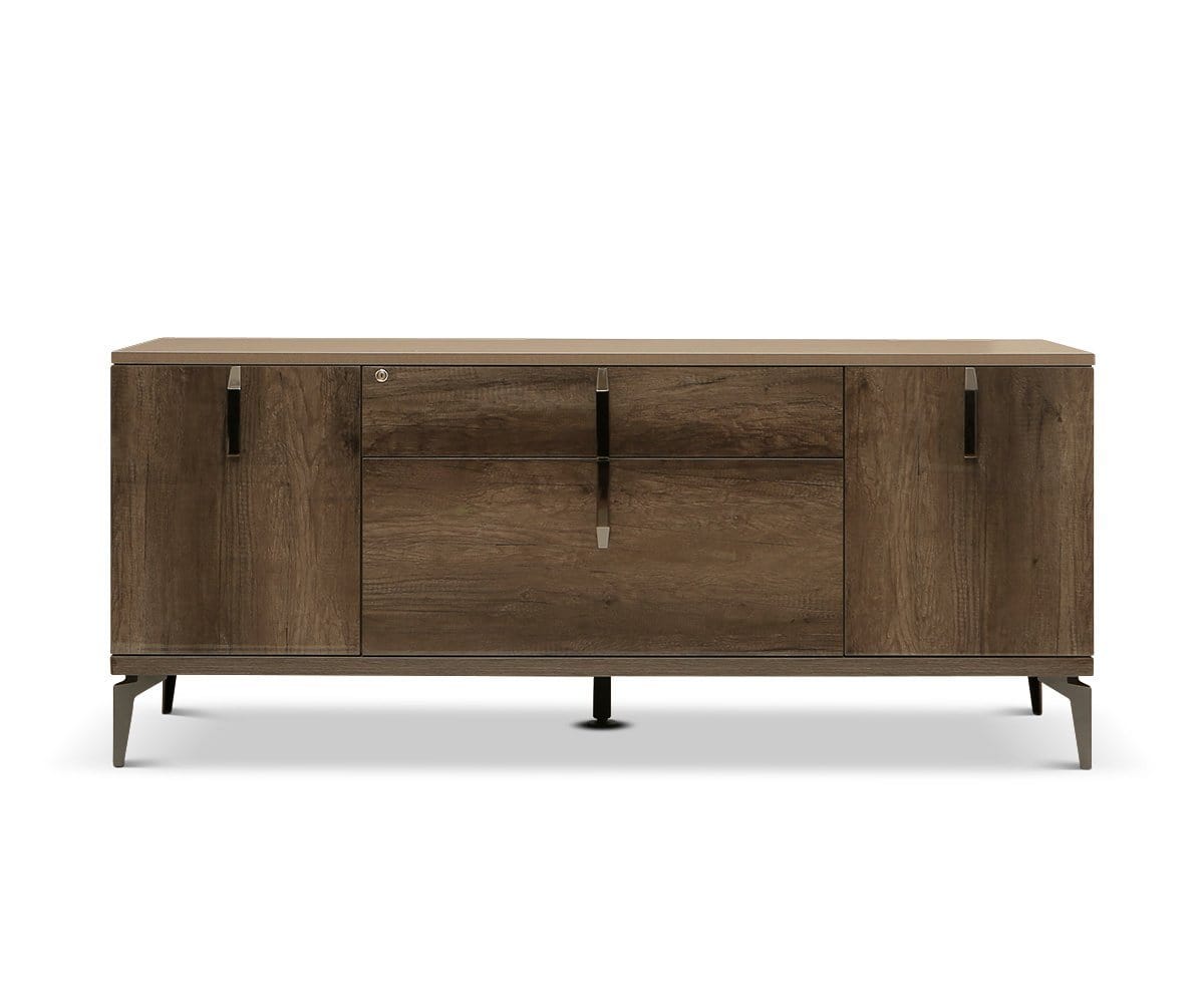 Give your new office space a touch of luxe with an organic feel. The Akana credenza is finished with a high gloss that highlights the wood grain gorgeously. Smoky chrome hardware completes the contemporary aesthetic. A variety of storage options help you organize, including two spacious drawers and two cabinets with four shelves.