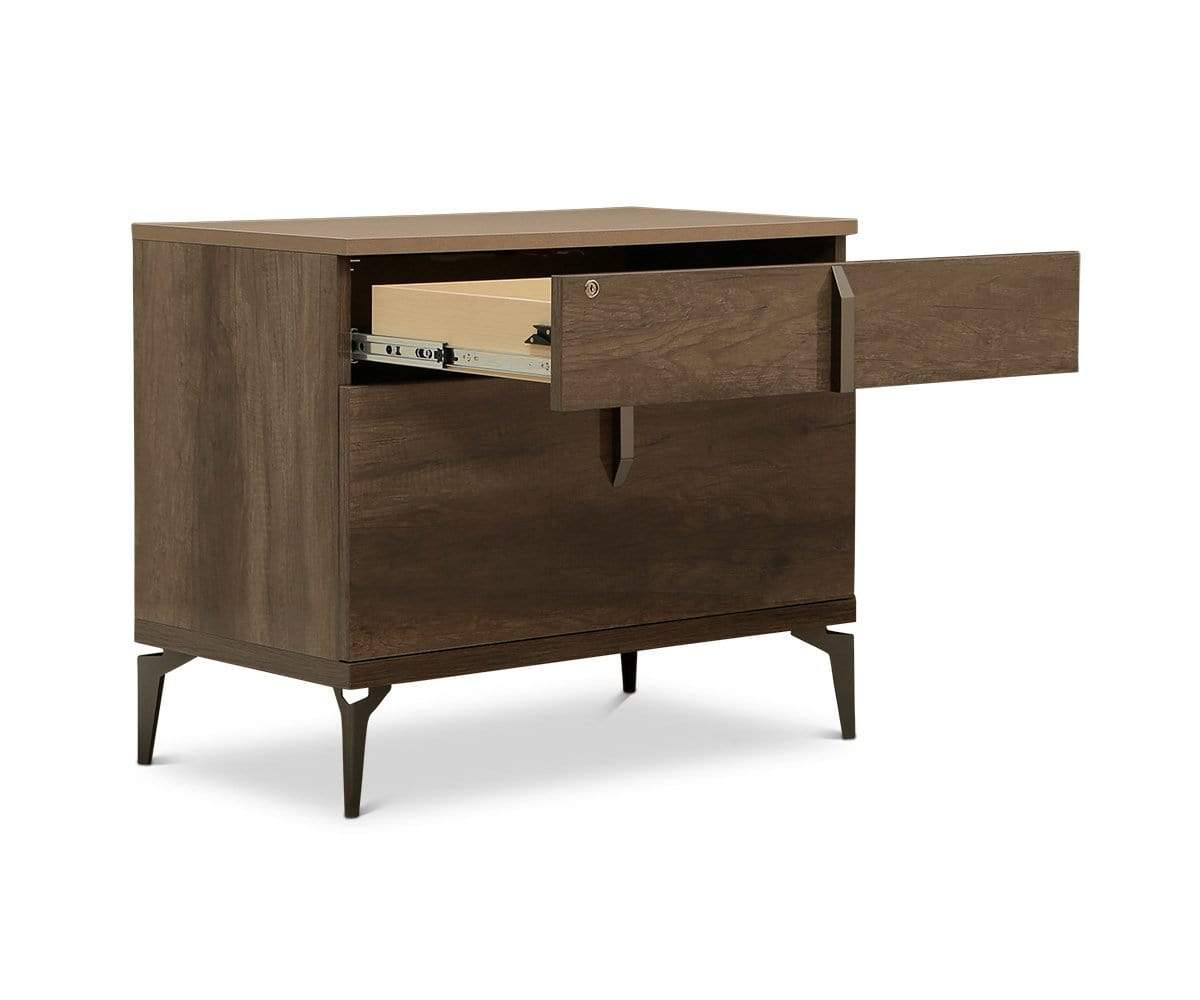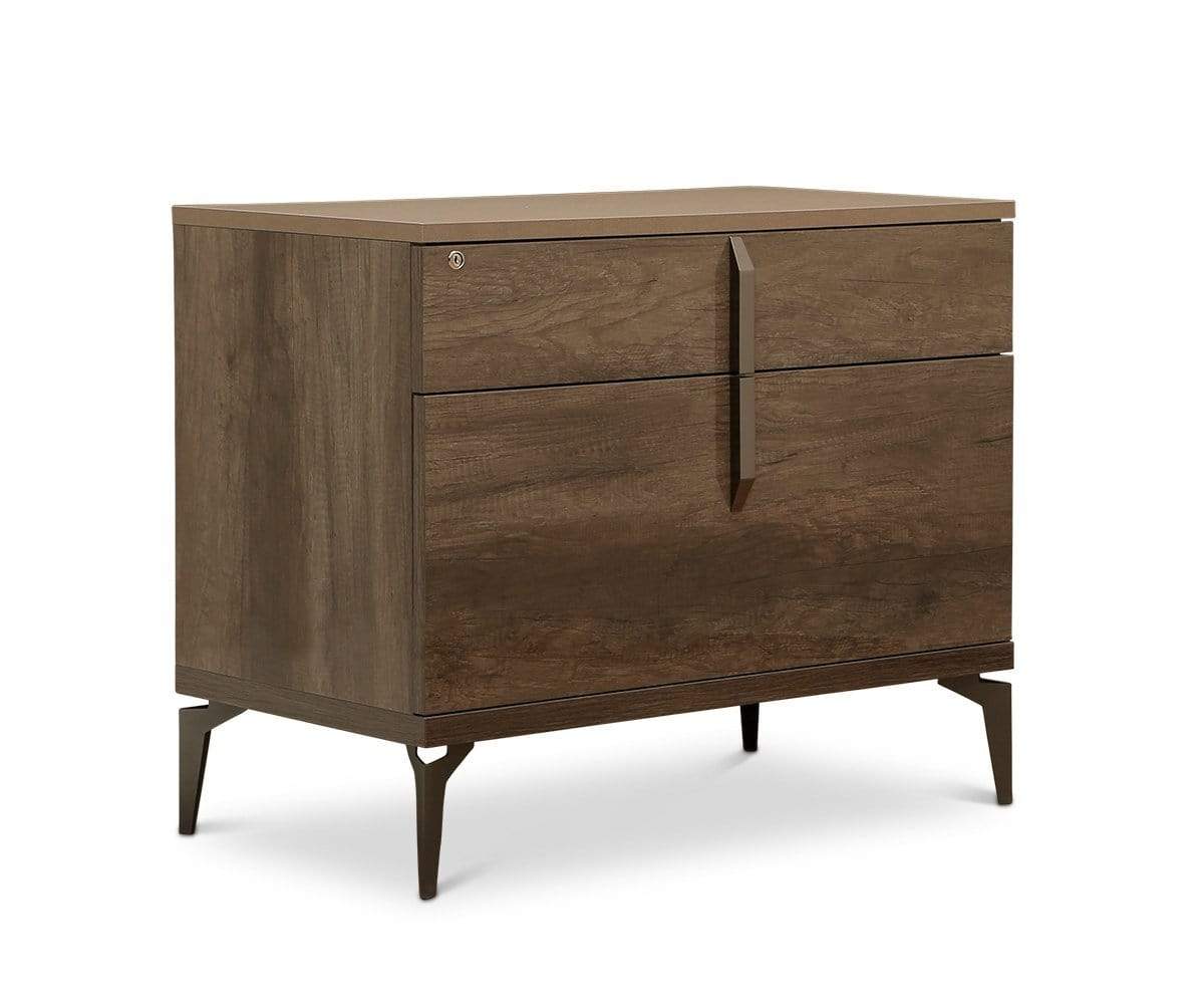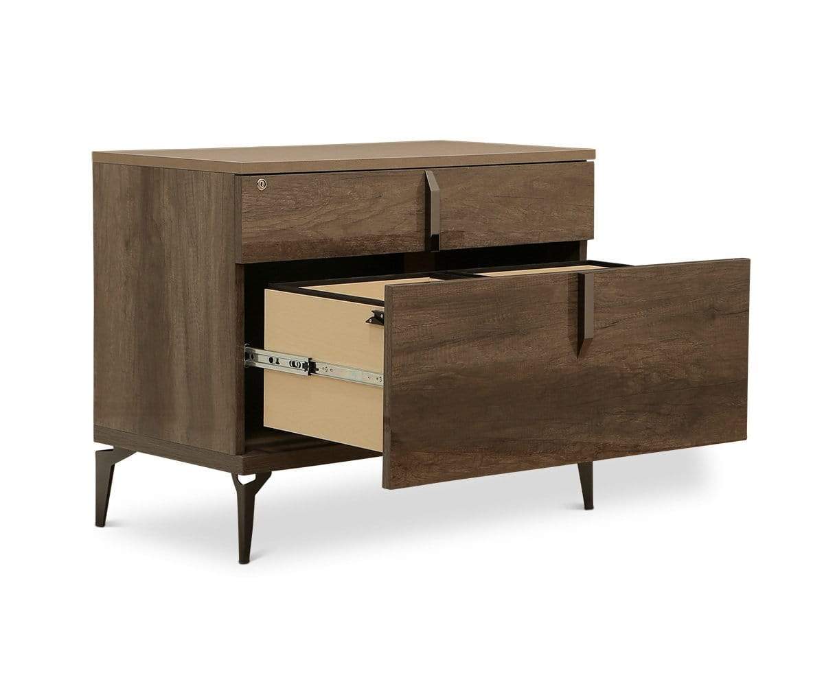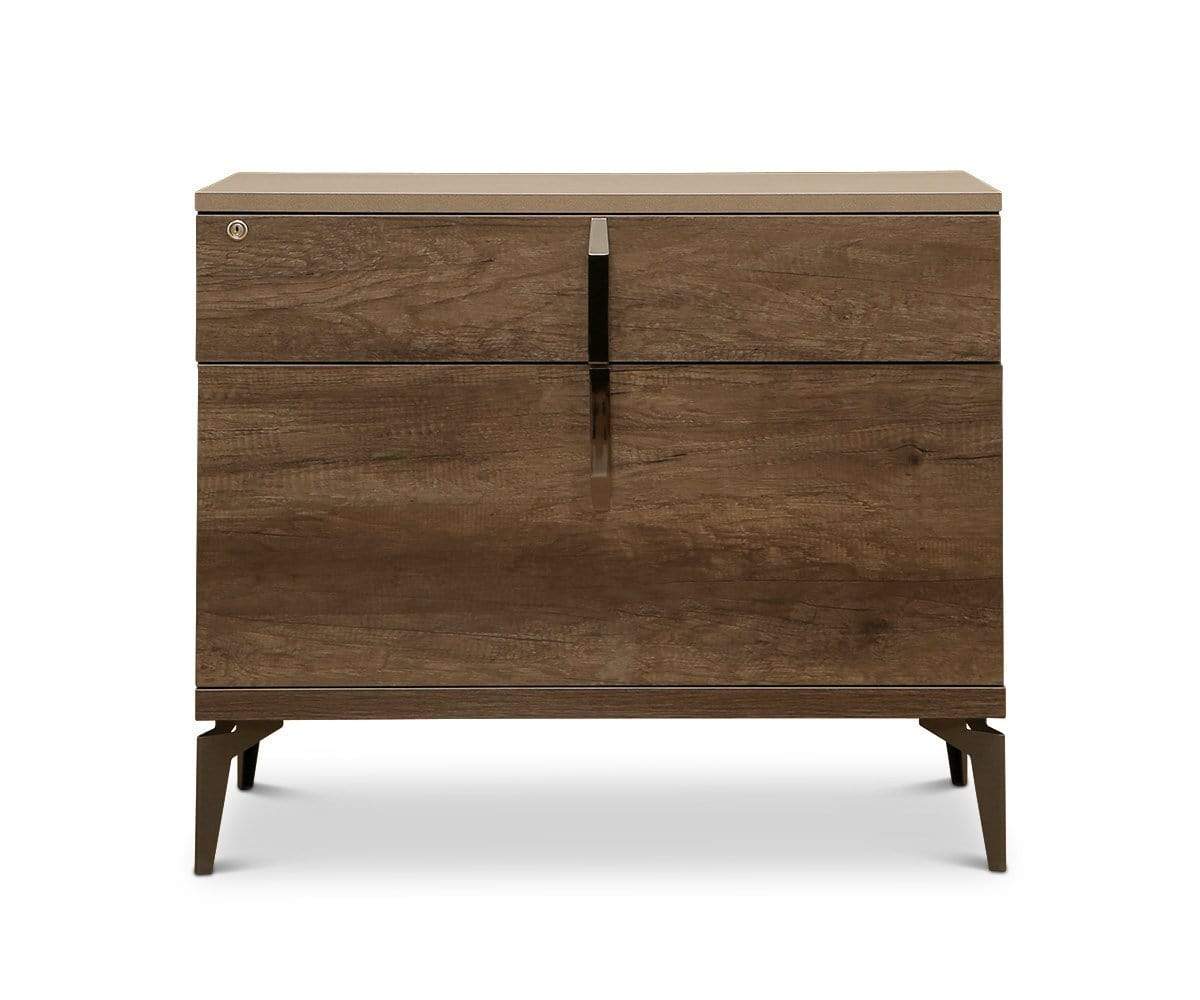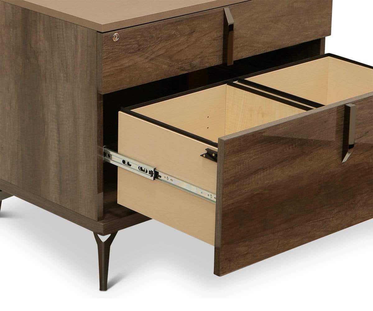 Hello, quick and easy storage. The Akana lateral file is finished with a high gloss that highlights the wood grain gorgeously for a luxe, yet organic tone. Smoky chrome hardware completes the contemporary aesthetic. Two drawers—one shallow lock drawer, one deep storage drawer—keep your essentials handy and secure.