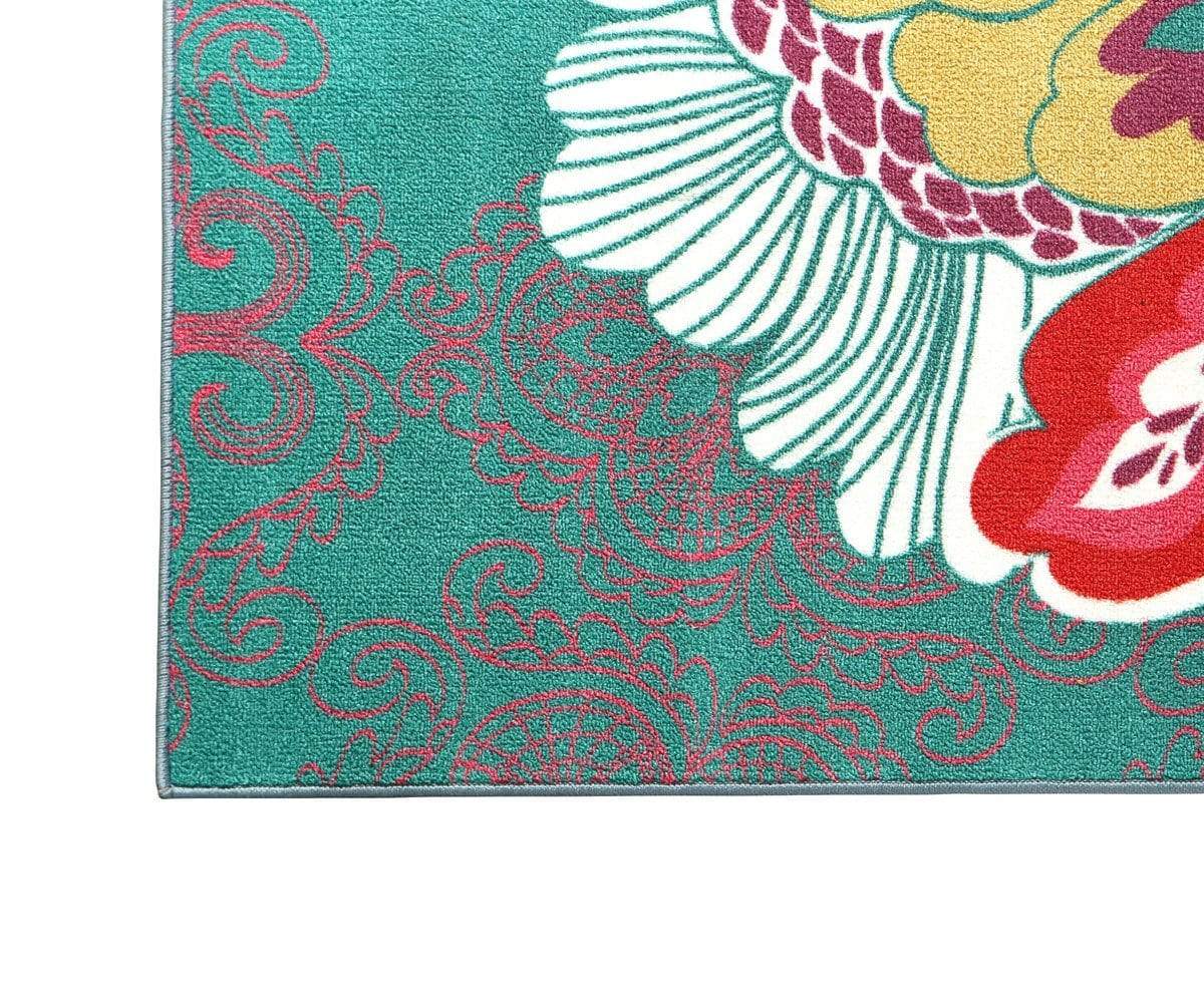 The Amaranda rug brings a splash of color to any room. With a bright teal background, the large multicolor flower graphic pops. Made from 100% nylon for easy cleaning and durability.