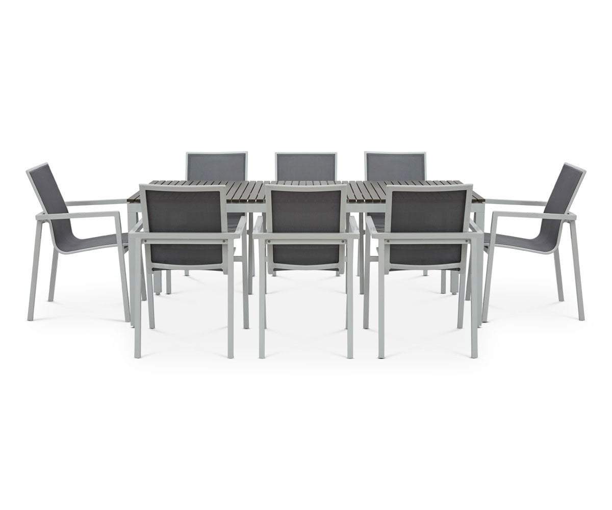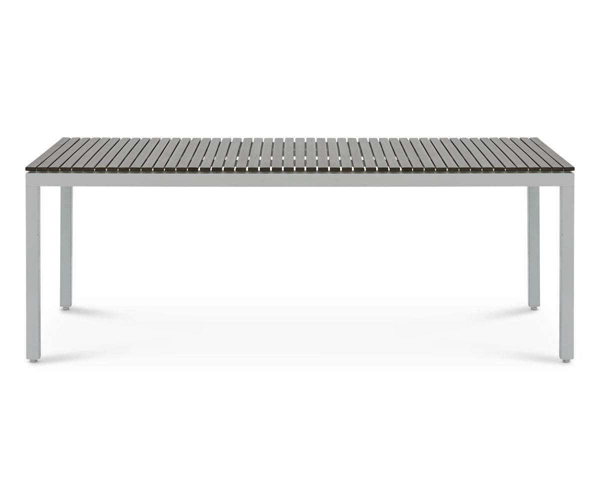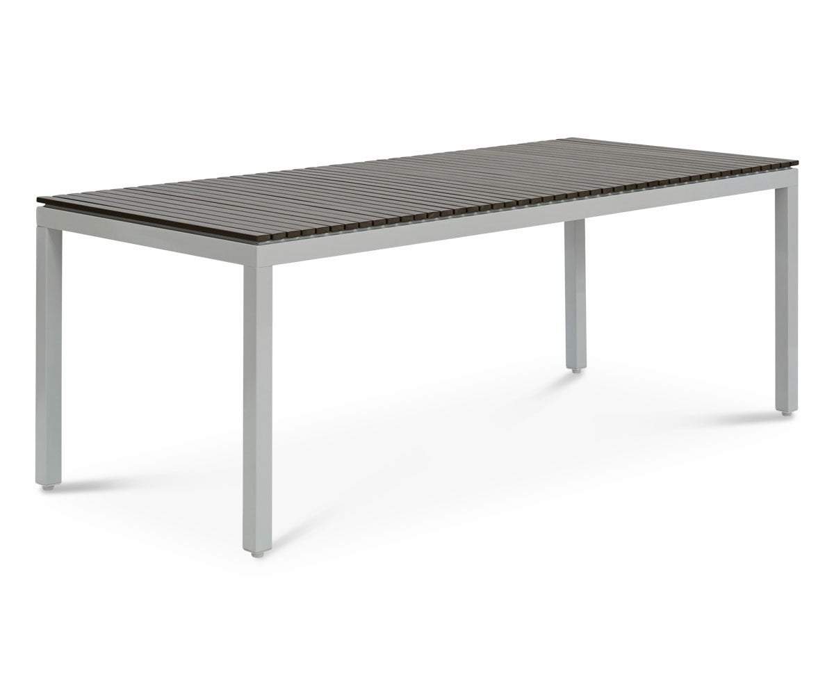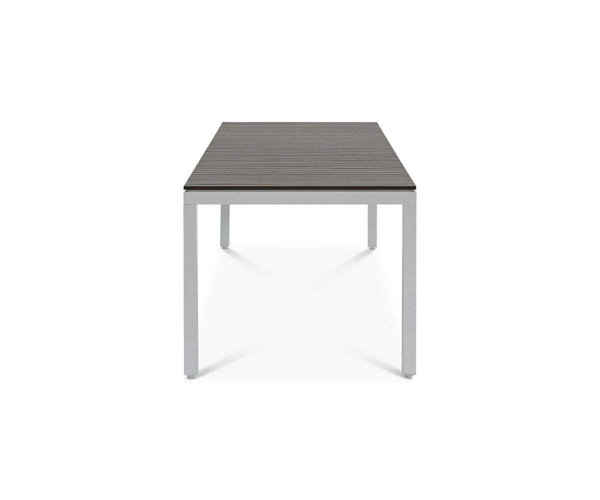 The Aurora rectangular dining table allows room for your gathering to expand. Comfortably seat six and fully enjoy outdoor entertaining. Crafted of a white powder-coated aluminum frame with a tabletop in resin wood slats, it is both durable and lightweight for use season after season.