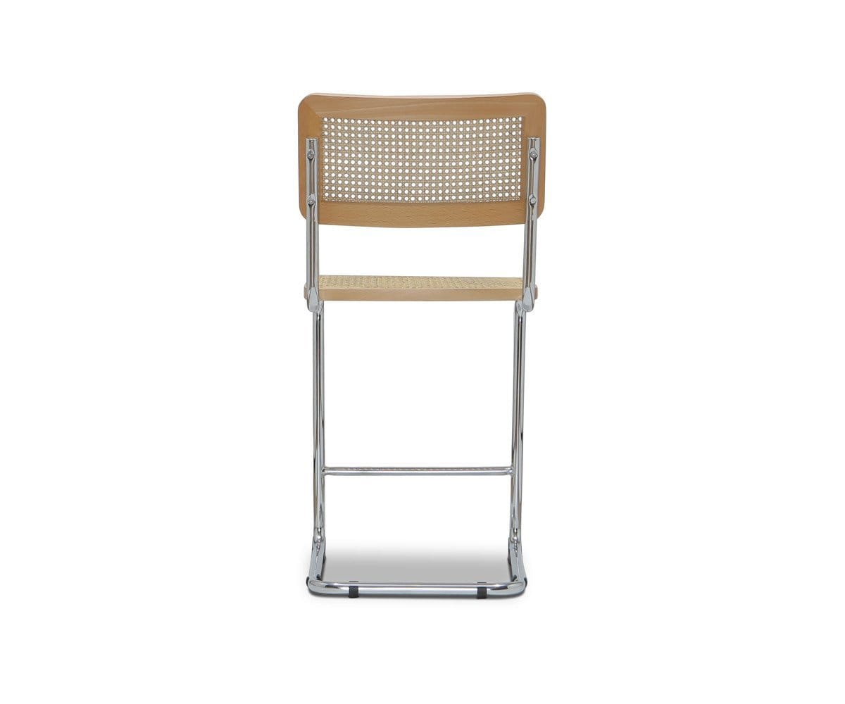 The Bendt counter stool is crafted with solid European beech that frames the cane seat and backrest. A cantilevered metal frame is finished in polished chrome for a distinctive mid-century look.