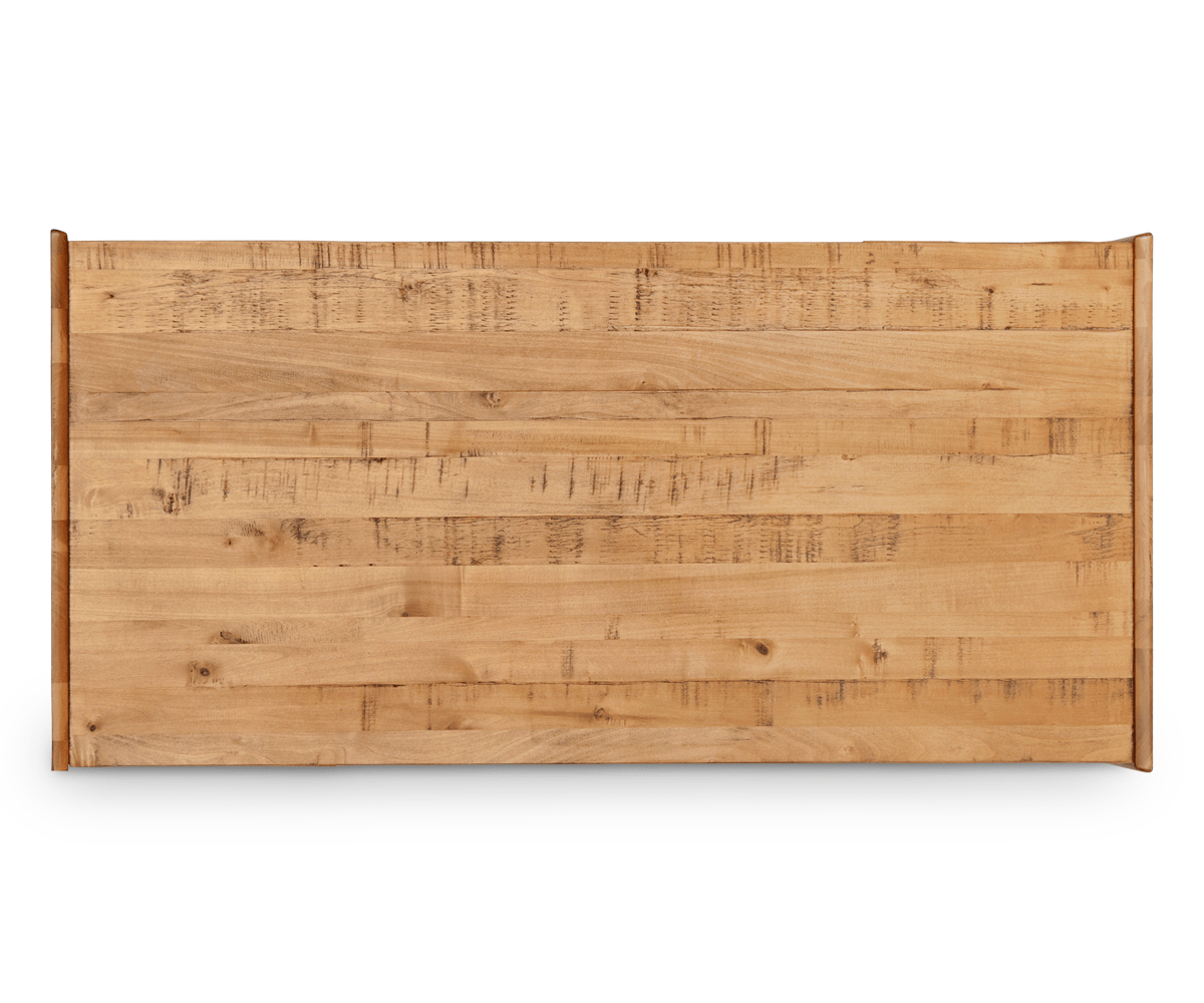 Command attention with the Bolig coffee table. Four round, tapered legs with brass capped feet support the stout unit crafted from solid American poplar with a distressed finish. Two drawers and an open niche are perfect for storing remotes, coasters and other miscellaneous items in this Scandinavian charmer. The rustic reclaimed look of this collection is achieved through an intentional distressing technique that applies burn and saw marks to the surface while retaining and highlighting natural characteristics in the wood. This technique results in a reclaimed driftwood appearance, which adds personality and a one-of-a-kind uniqueness to each piece.
