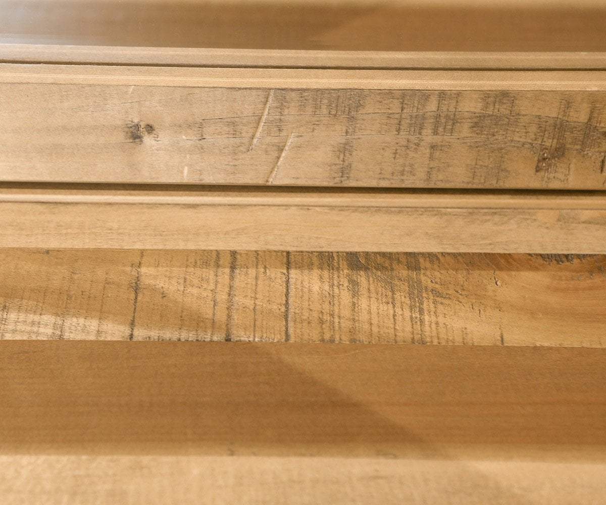 True Scandinavian character shines in the Bolig large leaning bookcase. Clean lines, angled perfectly form the shelves of graduating depths, while two drawers layer in convenient storage. Supported by graceful, tapered legs, this functional piece is crafted from solid American poplar with a distressed finish. The rustic reclaimed look of this collection is achieved through an intentional distressing technique that applies burn and saw marks to the surface while retaining and highlighting natural characteristics in the wood. This technique results in a reclaimed driftwood appearance, which adds personality and a one-of-a-kind uniqueness to each piece.