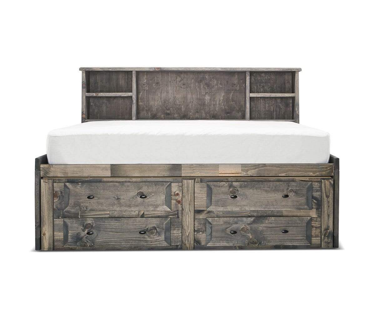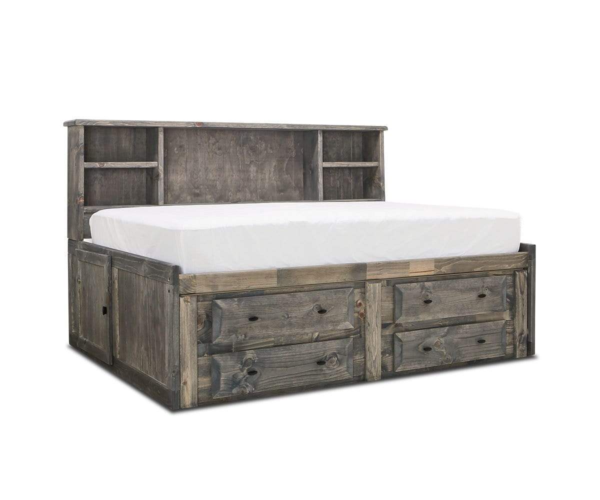 An adventurous profile and versatile storage make the Brennan captain's bed a can't-miss. This piece features a built-in bookcase (hello, favorite reading spot!) and storage drawers (hurrah for space-saving!). Plus, two side doors let you stash bedding beneath the mattress. It's crafted with a solid Northern California pine frame and finished with a grey driftwood stain, making it easy to sand and refinish if the surface is nicked. Available in Full and Twin sizes.