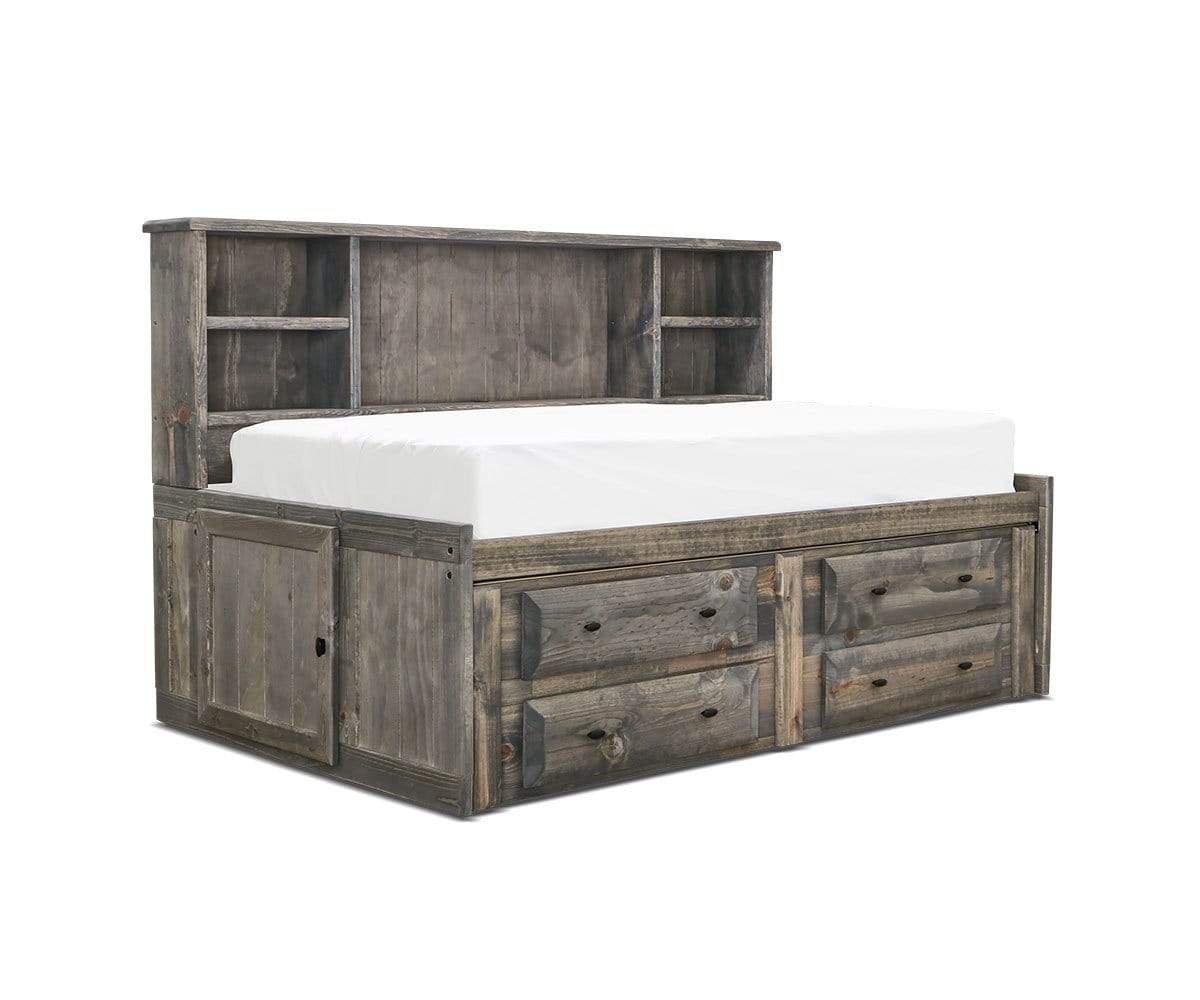 An adventurous profile and versatile storage make the Brennan captain's bed a can't-miss. This piece features a built-in bookcase (hello, favorite reading spot!) and storage drawers (hurrah for space-saving!). Plus, two side doors let you stash bedding beneath the mattress. It's crafted with a solid Northern California pine frame and finished with a grey driftwood stain, making it easy to sand and refinish if the surface is nicked. Available in Full and Twin sizes.