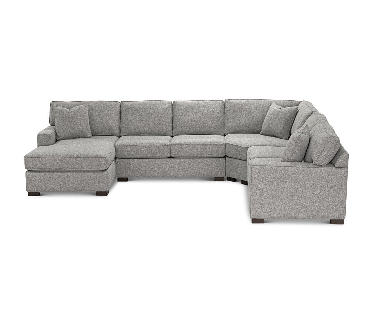 This is family seating at its finest. The Dinan sectional blends a modern sensibility with easy comfort. Firm cushions, deep seat depth and low backrests come together in a sleekly, tailored design. With a corner seat and chaise end, it comfortably seats up to six people.