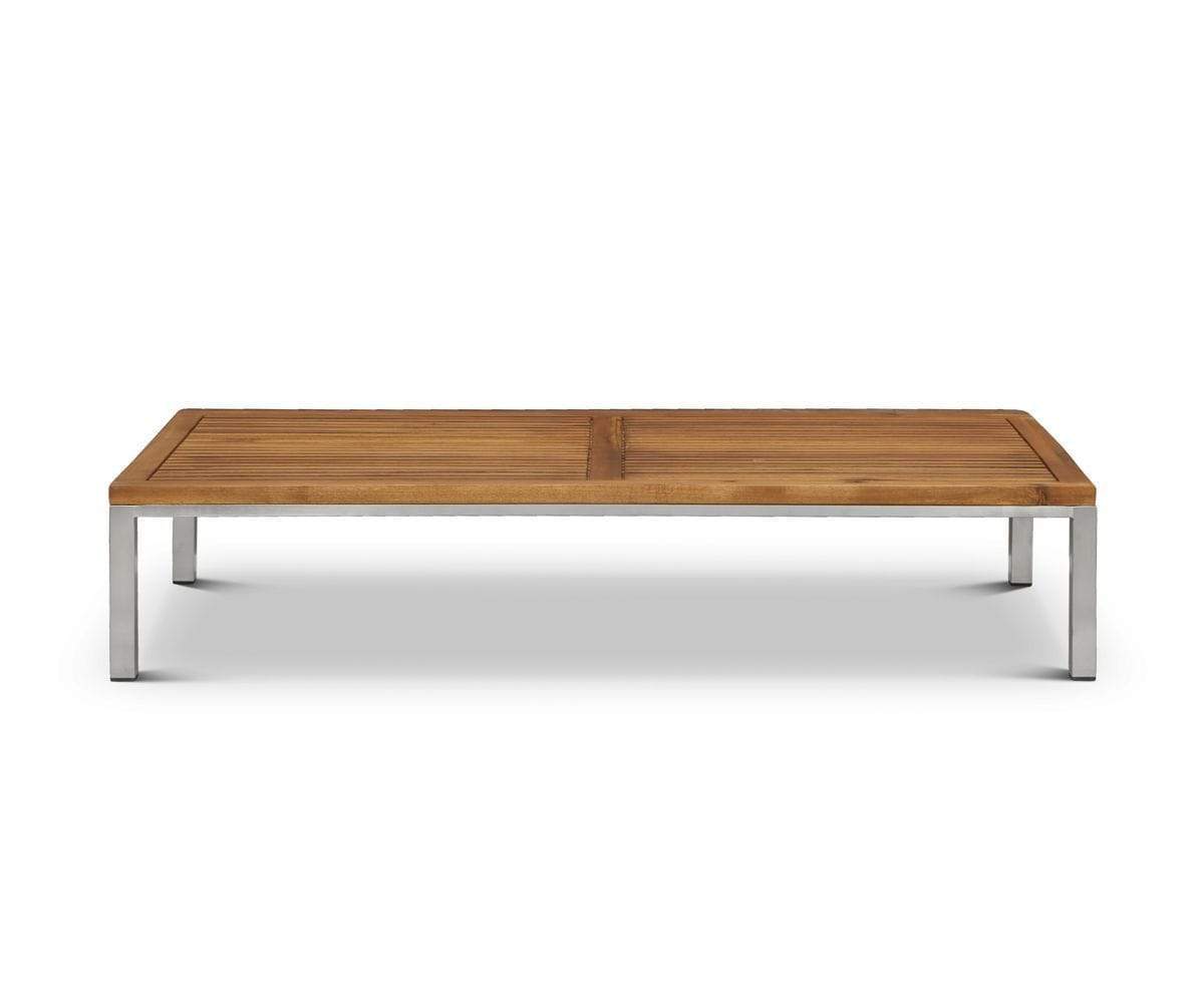 The low profile of the Farino coffee table is perfect for relaxed vibes. A rich, solid acacia tabletop combines with stainless steel legs for a durable, yet fashionable outdoor centerpiece. Create a modern, vibrant patio set with accompanying Farino armless and corner sofas.