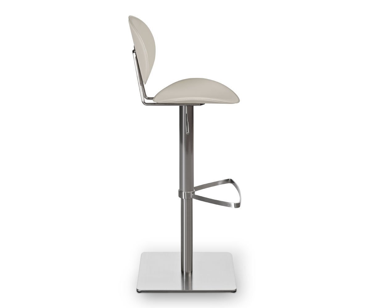 A collage of interesting shapes creates the intriguing design of the Frida adjustable counter and bar stool. The supportive seat and back are tailored in handsome upholstery with a brushed steel base and footrest. This truly contemporary piece blends style from the past with design of tomorrow.