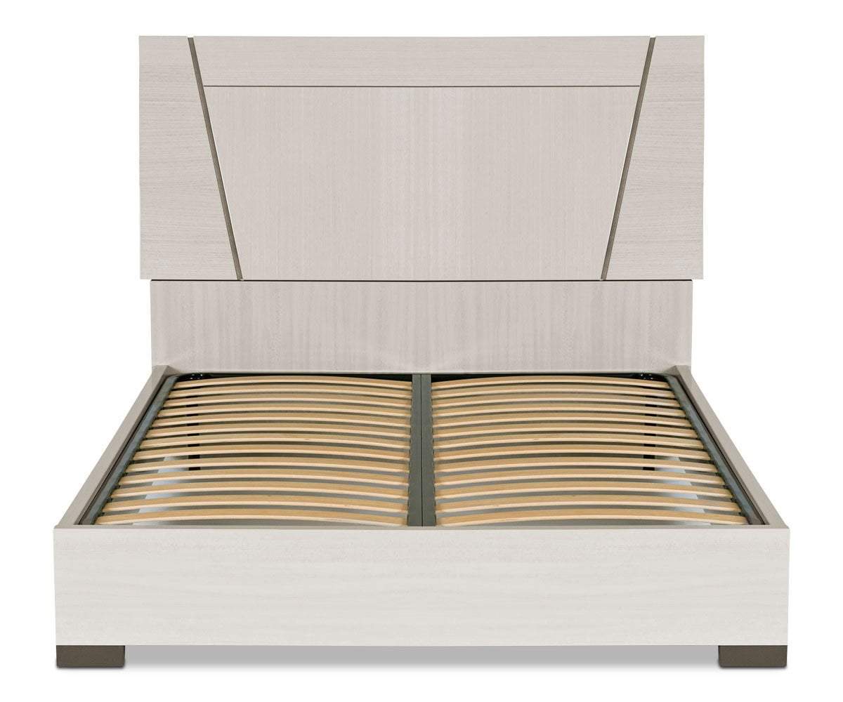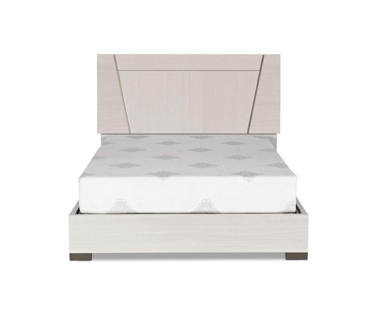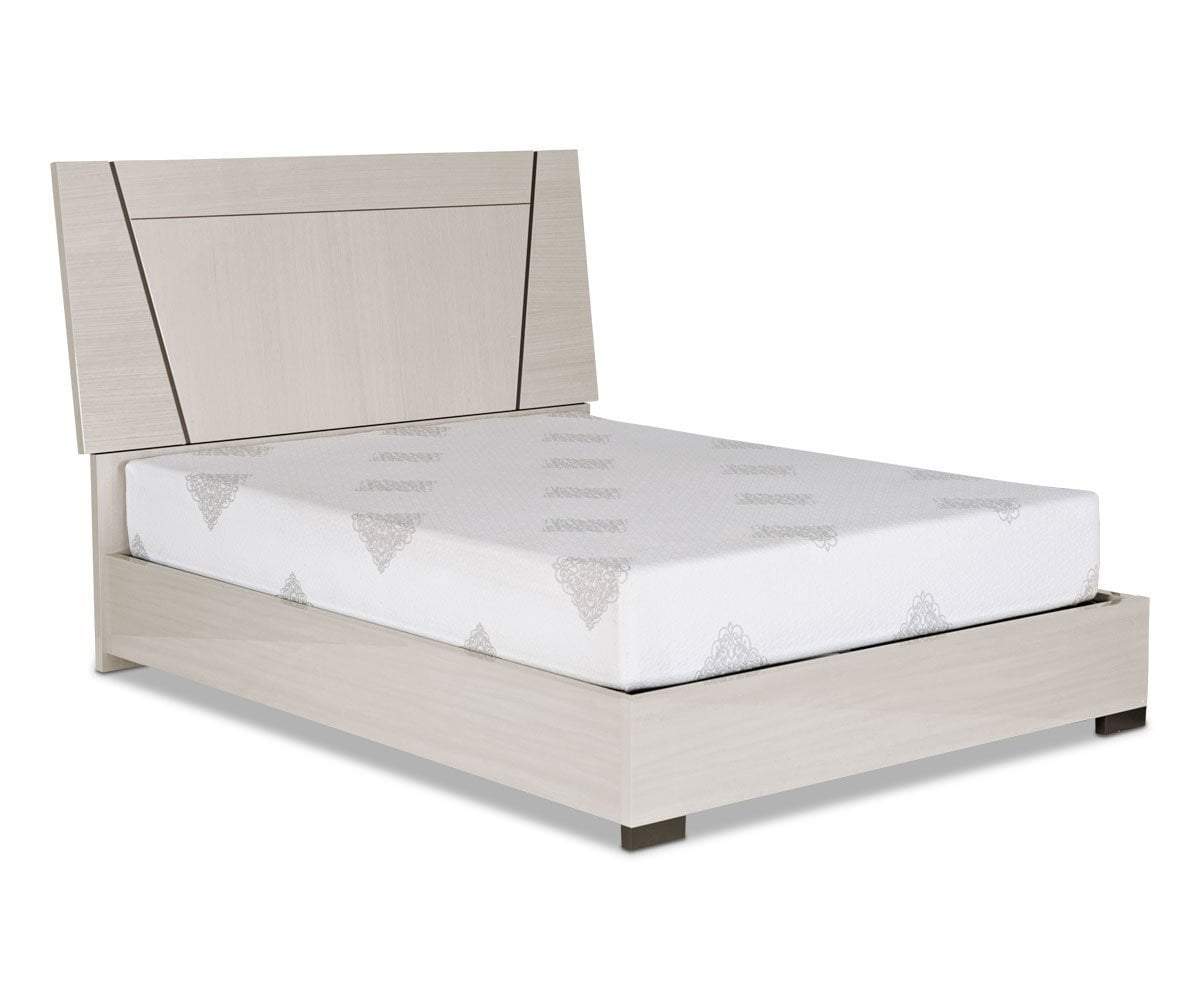 Elegant angles define the Monchiaro bed and create an instant focal point in your bedroom. The platform style bed and high headboard are constructed of a high-gloss, light grey koto wood veneer that will transform you room into an elegant oasis.
