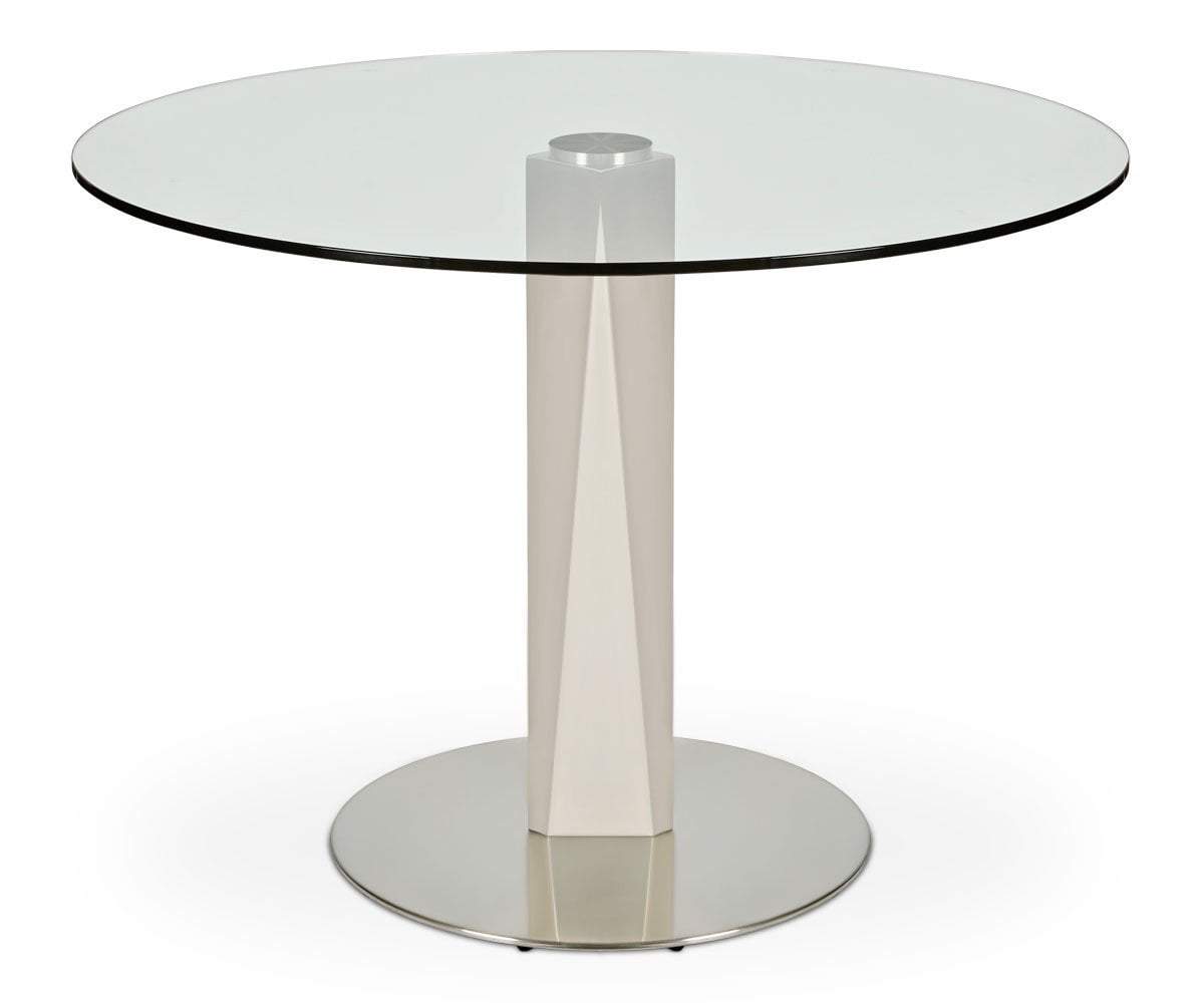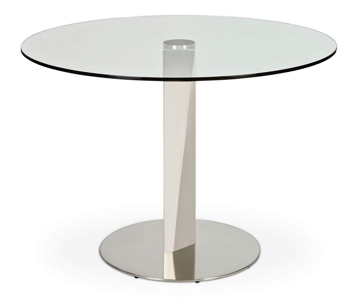 Get in on the cutting-edge of design with the Vispa round dining table. Clear tempered glass tabletop and a smooth, chiseled stainless steel base hint at the future. Streamlined and unique, dress up your dining area in style and comfortably seat four.